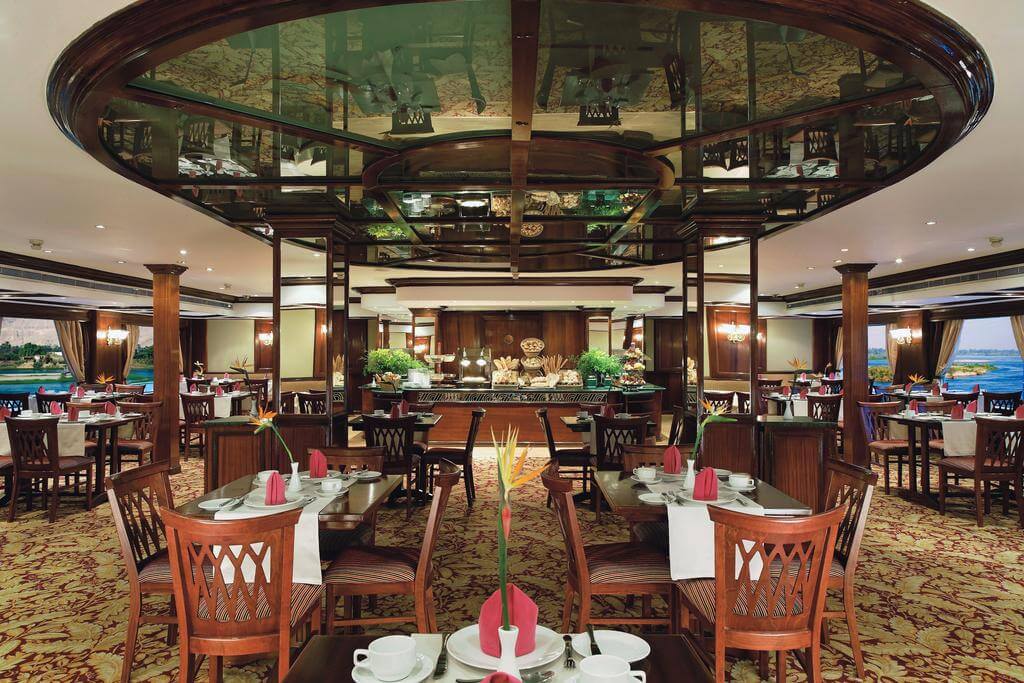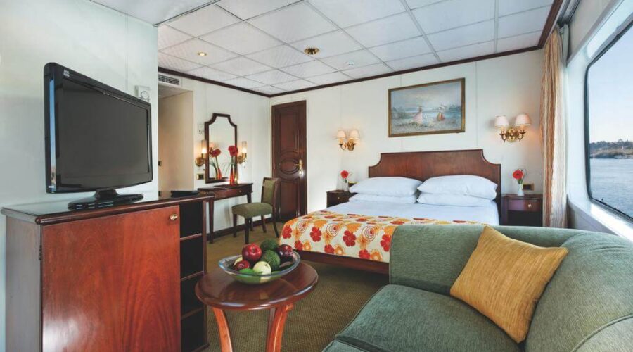 The Radamis II Nile Cruise is a stylish five-star ship that combines modern comfort with the timeless charm of the Nile. Sailing between Luxor and Aswan, this elegant cruise offers spacious cabins with panoramic views, a relaxing sun deck with swimming pool, and gourmet dining that blends international flavors with authentic Egyptian cuisine. Guests can also enjoy warm hospitality and evening entertainment that reflects local traditions.